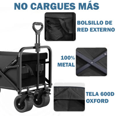 Transportá todo con facilidad y comodidad con este carrito plegable resistente, ideal para camping, playa, jardín, compras o uso doméstico. Su estructura de acero y tela Oxford de doble capa 600D garantizan durabilidad y resistencia al desgaste.