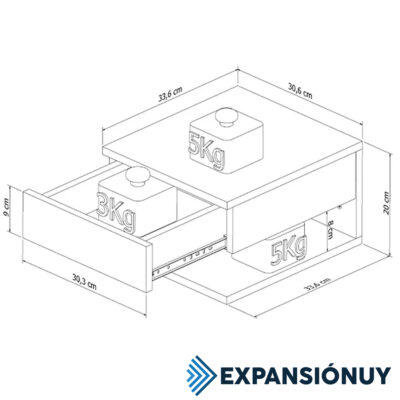 Incluye 1 cajón con correderas metálicas, 1 nicho revistero abierto y todo lo necesario para amurarla a la pared de forma segura. Soporta hasta 13 kg y se entrega desarmada con manual e insumos de instalación para un armado sencillo.