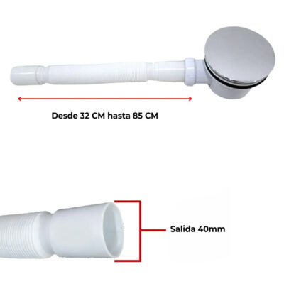 Fabricado en ABS de alta resistencia, ofrece gran durabilidad en ambientes húmedos y un diseño extensible que facilita la instalación. Su acabado cromado aporta una estética moderna y resistencia a la corrosión. Es totalmente compatible con los receptáculos de metacrilato, asegurando un funcionamiento óptimo y sin obstrucciones.