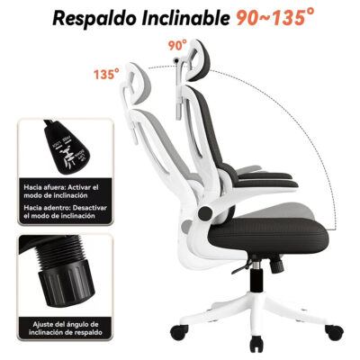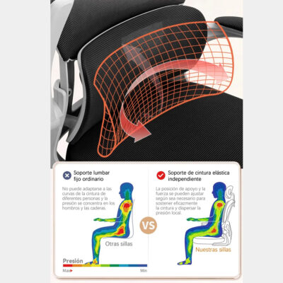 Diseñada para brindar el máximo confort durante largas jornadas de trabajo, esta silla ergonómica de oficina y escritorio reclinable combina funcionalidad y estilo moderno. Su respaldo de malla transpirable favorece la ventilación y evita la acumulación de calor, mientras que el apoyo lumbar ajustable y el reposacabezas regulable garantizan una postura saludable y reducen la fatiga.