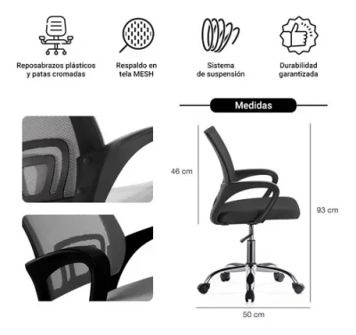 Máximo confort y funcionalidad con un diseño moderno y profesional. Su respaldo de malla transpirable, soporte lumbar fijo y estructura giratoria transforman cualquier espacio de trabajo en un entorno cómodo y eficiente. Ideal para largas jornadas, cuenta con ruedas para movilidad y brazos ergonómicos que mejoran tu postura y experiencia de uso.