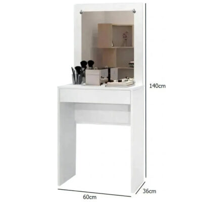 Cuenta con un cajón ubicado justo debajo de la superficie superior, ideal para guardar cosméticos, accesorios y artículos de uso diario. Incluye espejo superior que brinda comodidad al momento de maquillarse o arreglarse, creando un rincón funcional y elegante.
