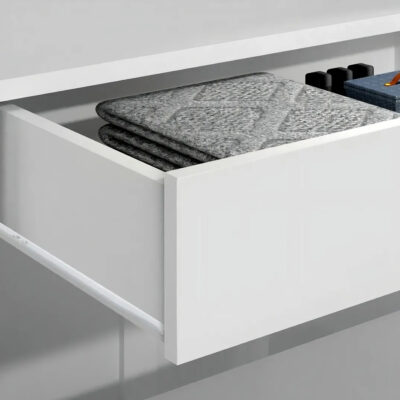Está producido en MDP de 12 y 15 mm y cuenta con acabado en pintura UV blanca con barniz brillante, lo que proporciona mayor durabilidad, resistencia y fácil limpieza.